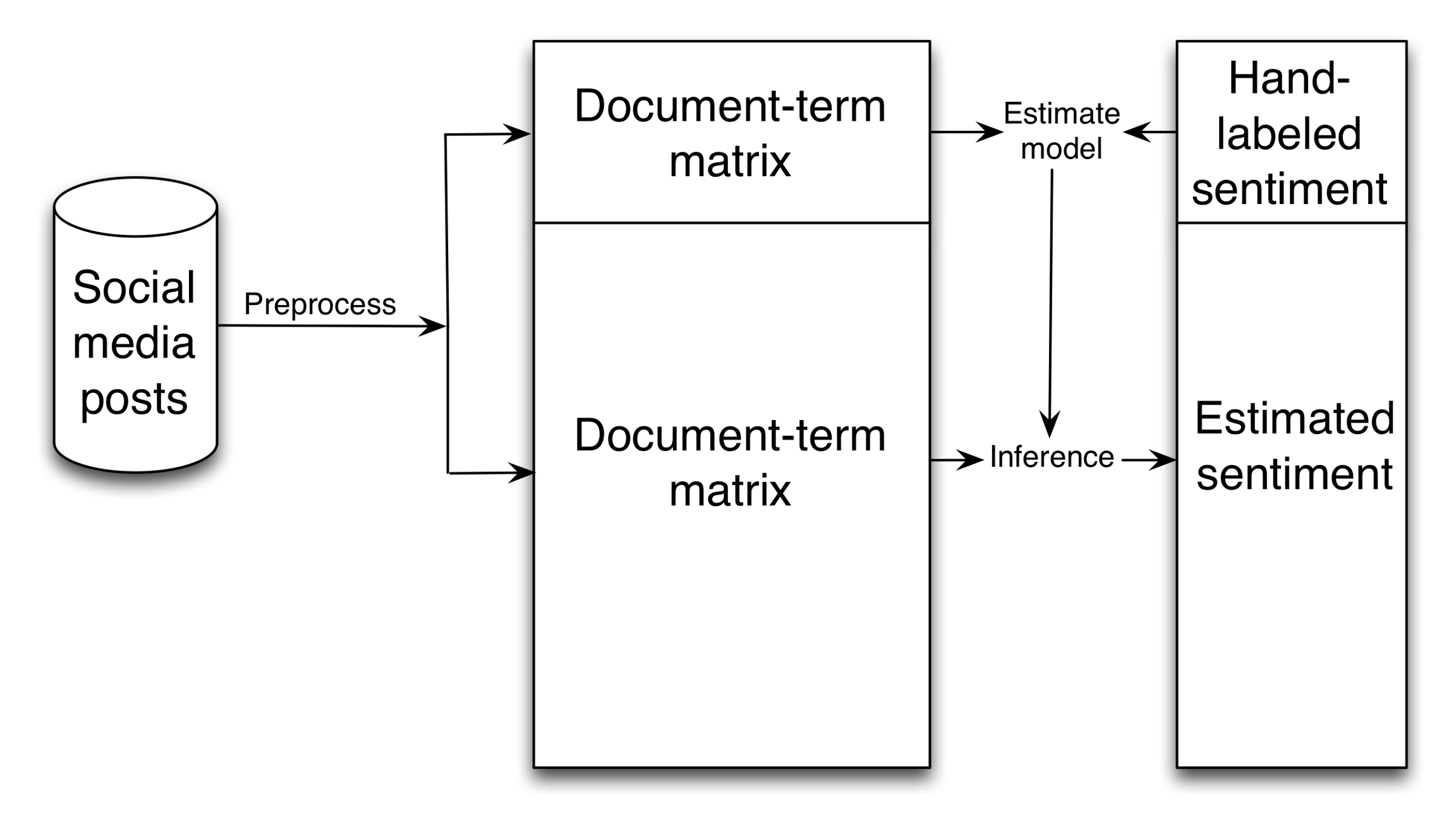 图2.5: King, Pan and Roberts(2013)估计 1100 万中国社交媒体帖子情感倾向的步骤的简化示意图。首先,在预处理步骤,研究者将帖子转为 文档-词语矩阵(document-term matrix)(更多信息见 Grimmer and Stewart(2013))。第二部,手工标记一部分帖子样本的情感倾向。第三步,他们训练了一个监督式学习的分类模型。第四部,他们用这个模型来估计所有帖子的情感倾向。更详细的介绍,见 King, Pan and Roberts (2013)的附录B。