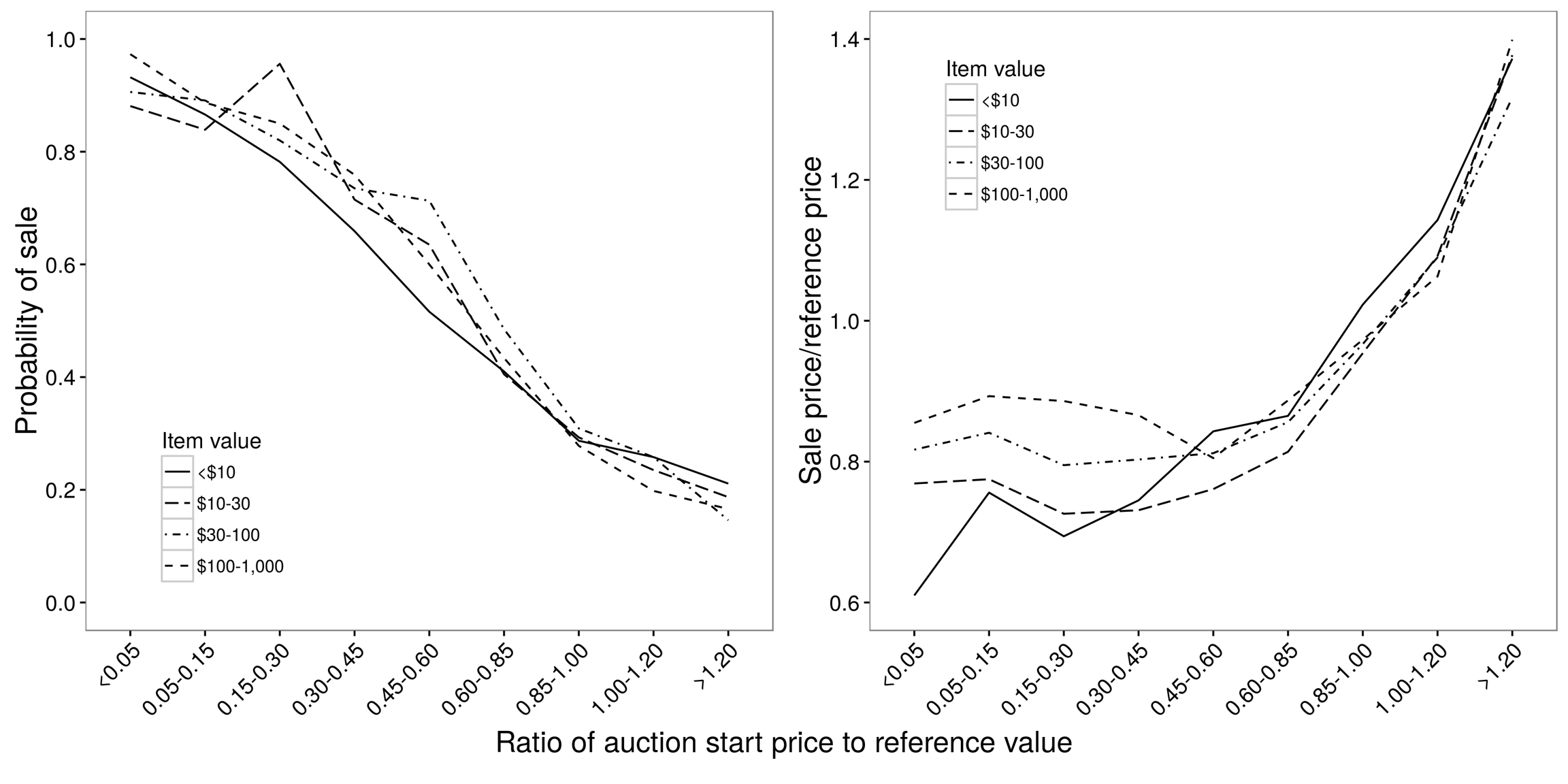 举个展现「匹配」强劲效果的例子。Liran Einav 与同事们 (2015) 使用「非实验数据」来研究消费行为。他们对 eBay 上的拍卖很感兴趣。下面我将重点介绍起拍价对成交价、流拍率等拍卖结果的影响。