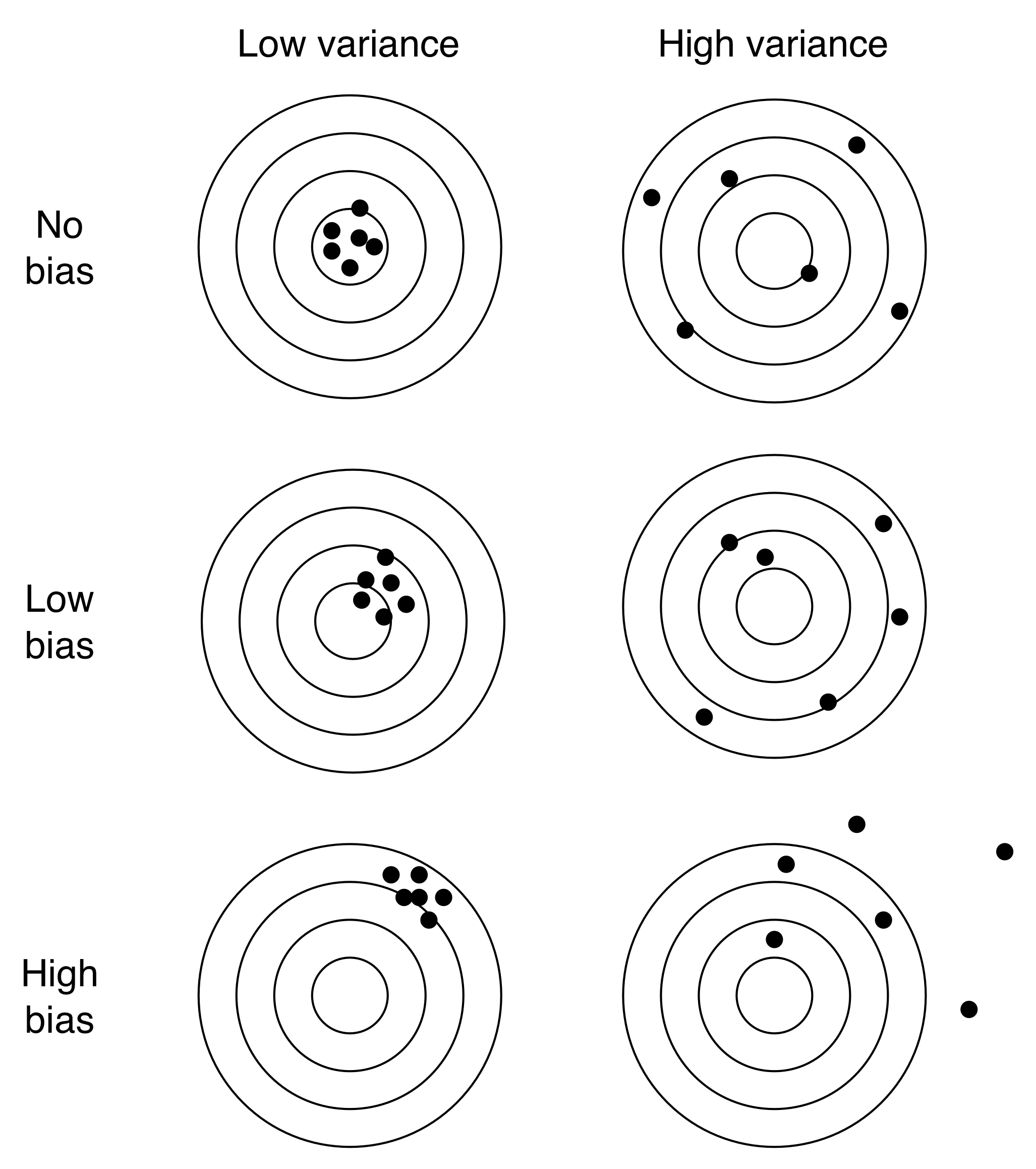 图 3.1: bias(偏差)和 variance (方差)。理想情况下,研究人员希望有一个无偏差、低方差的估计方式。但实际上,他们常常需要在偏差和方差之间权衡。尽管有些研究人员本能的倾向于无偏差的方式,但有时低偏差、低方差的方法会得到更准确的估计。